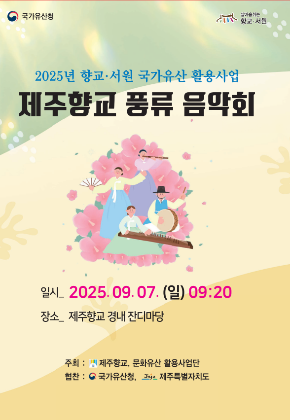 2025년 9월7일(일) 09:20부터 12시까지 제주향교 풍류음악회 및 제주특별자치도 장애인 협의회 와 함께 플로깅 행사를 시행 합니다.